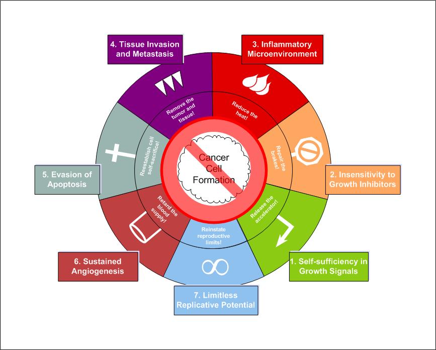 This drawing shows the medical approaches to countering each of the seven hallmarks of cancer.
