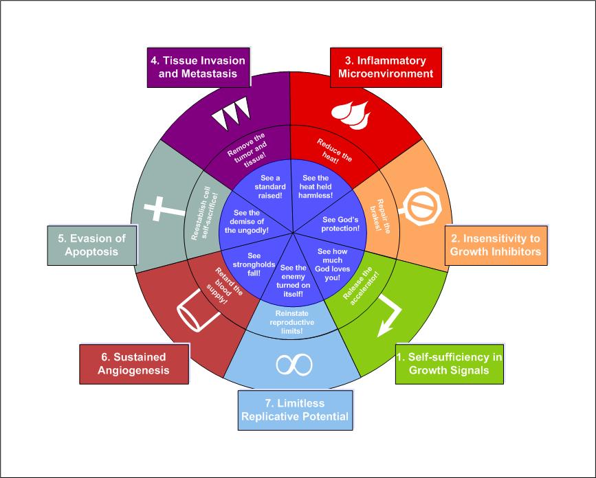 Here’s where we’re going: If the hallmarks of cancer show us the “gates” that allow cancer to develop and the environment that helps it thrive, then our approach must be to counteract each and every hallmark. This is done through using the Word of God, prayer, envisioning the counteractions taking place, and worship.